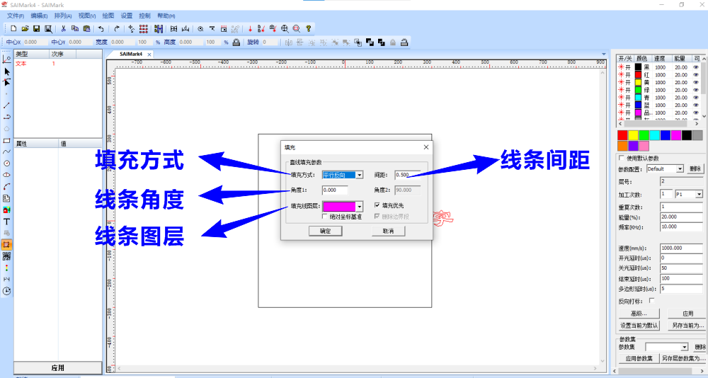 选择填充方式、确定线条间距、线条角度、线条打标图层,再点击“确定”